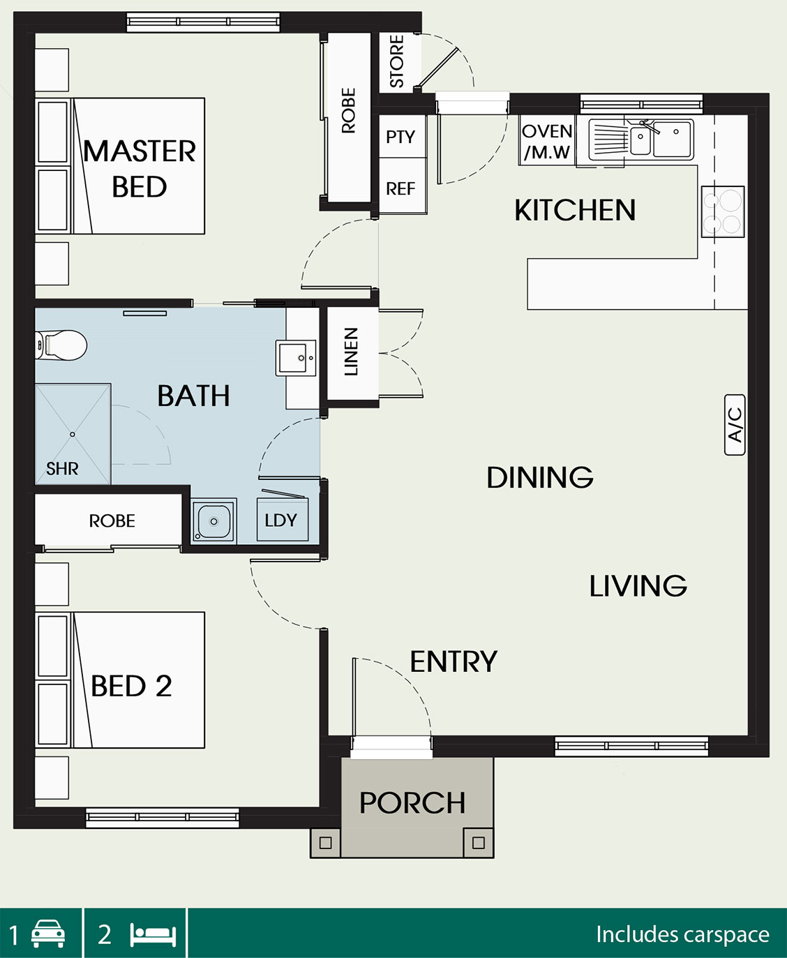Based on the “Mornington” floorplan, Villa 7 is a superbly crafted two-bedroom luxury villa featuring an open-plan living area, well-appointed kitchen with Caesarstone® benchtops, built-in robes, pantry and linen closet. Its six-star-rated construction features double-glazed windows, imported La Escandella terracotta roofing tiles and premium Daniel Robertson bricks.